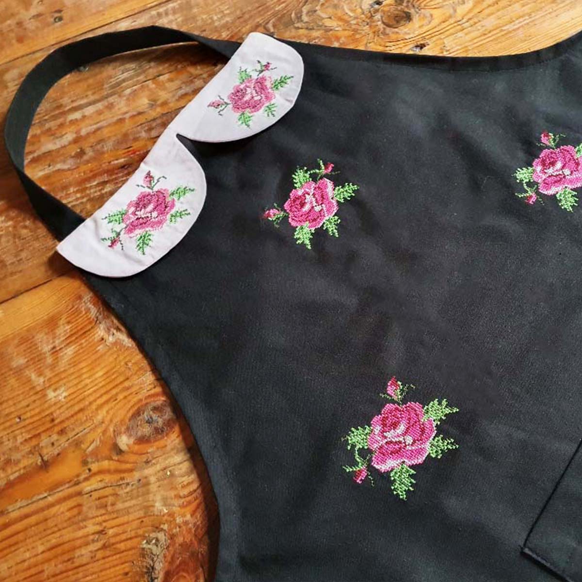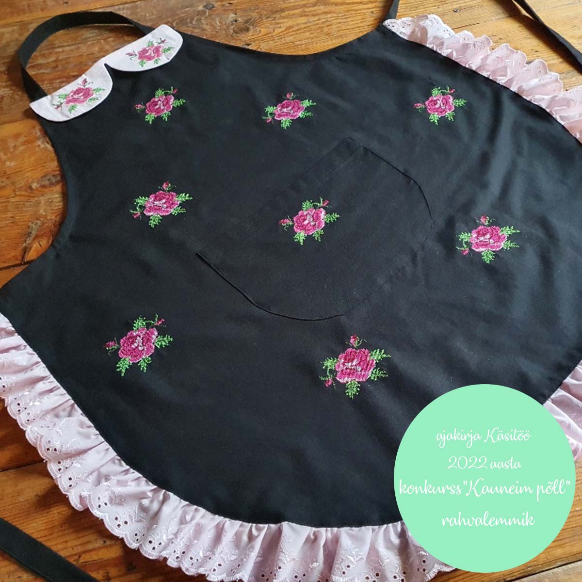 2022 aasta käsitöökonkursi rahva lemmiku võitja. Kraega ja tikitud roosikestega must linane põll. Ees tasku. Kaunistuseks broderiipits.