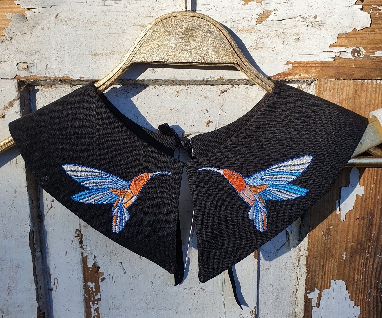 Jäälinnu tikandiga must linane krae. Tagant seotav sametpaelaga.