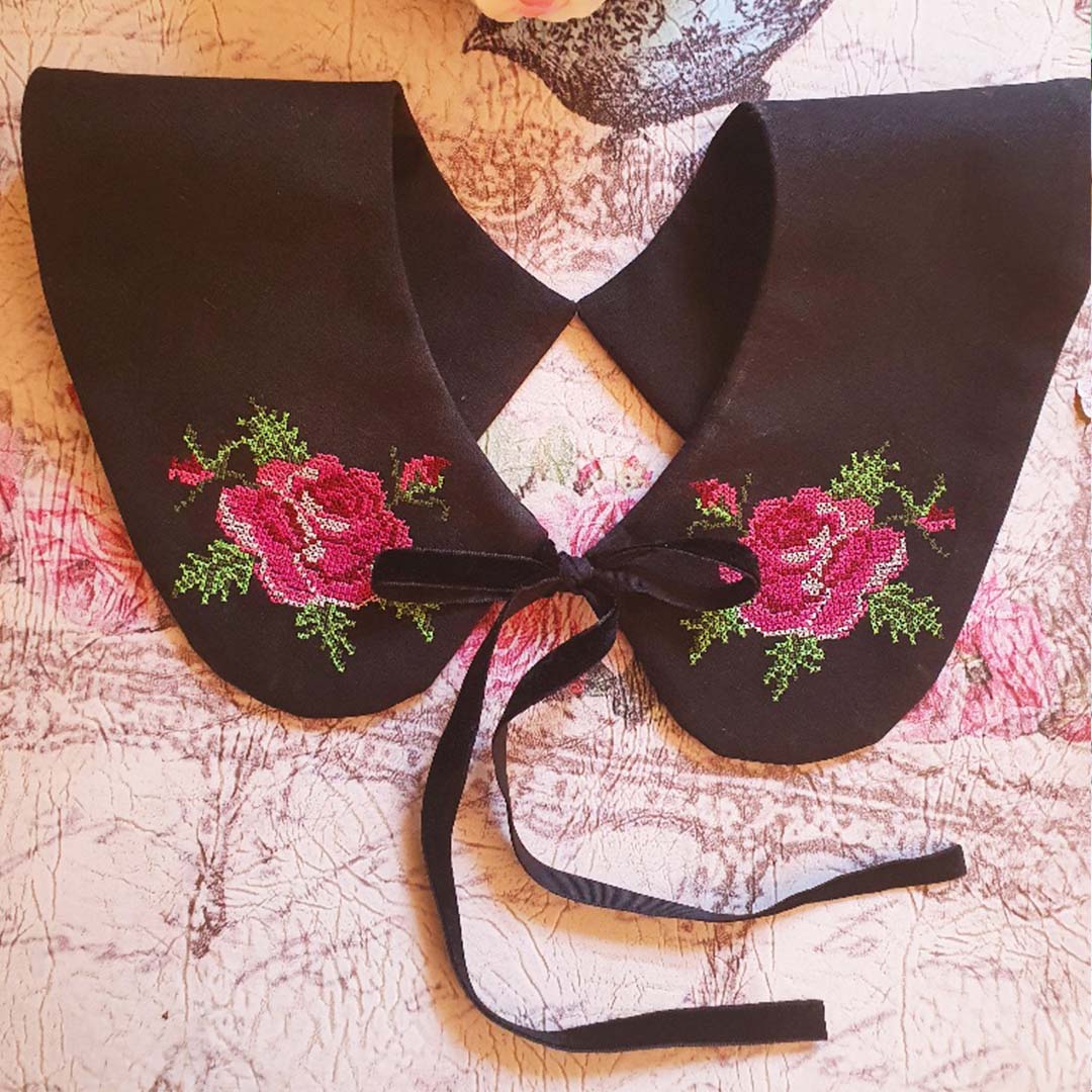 Must linane krae, ümarate nurgadega, mida kaunistab ristpistes roositikand. Eest seotav musta sametpaelaga.