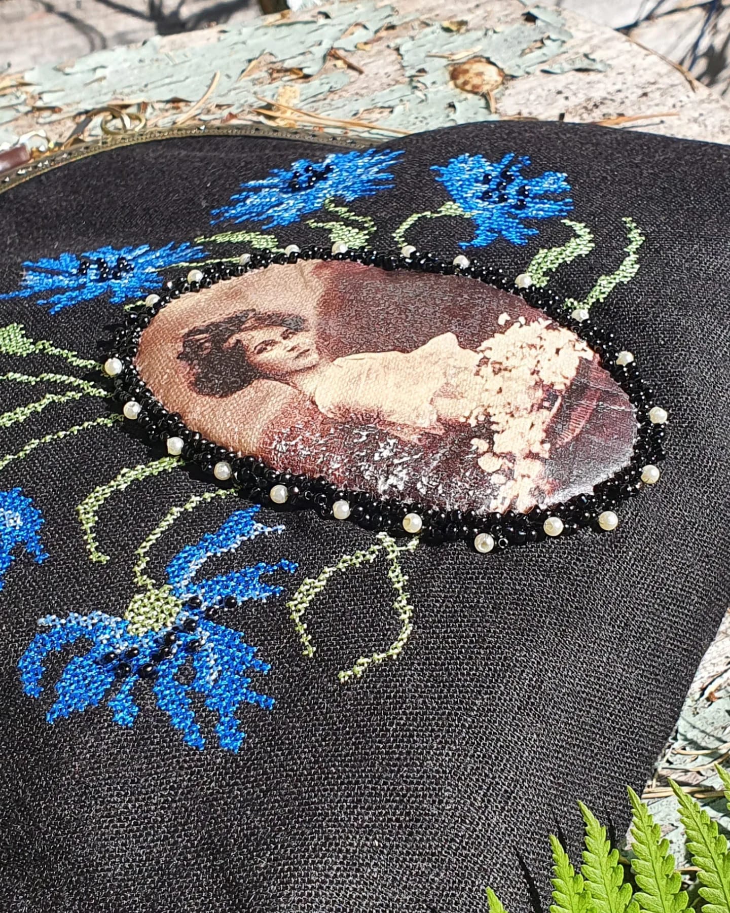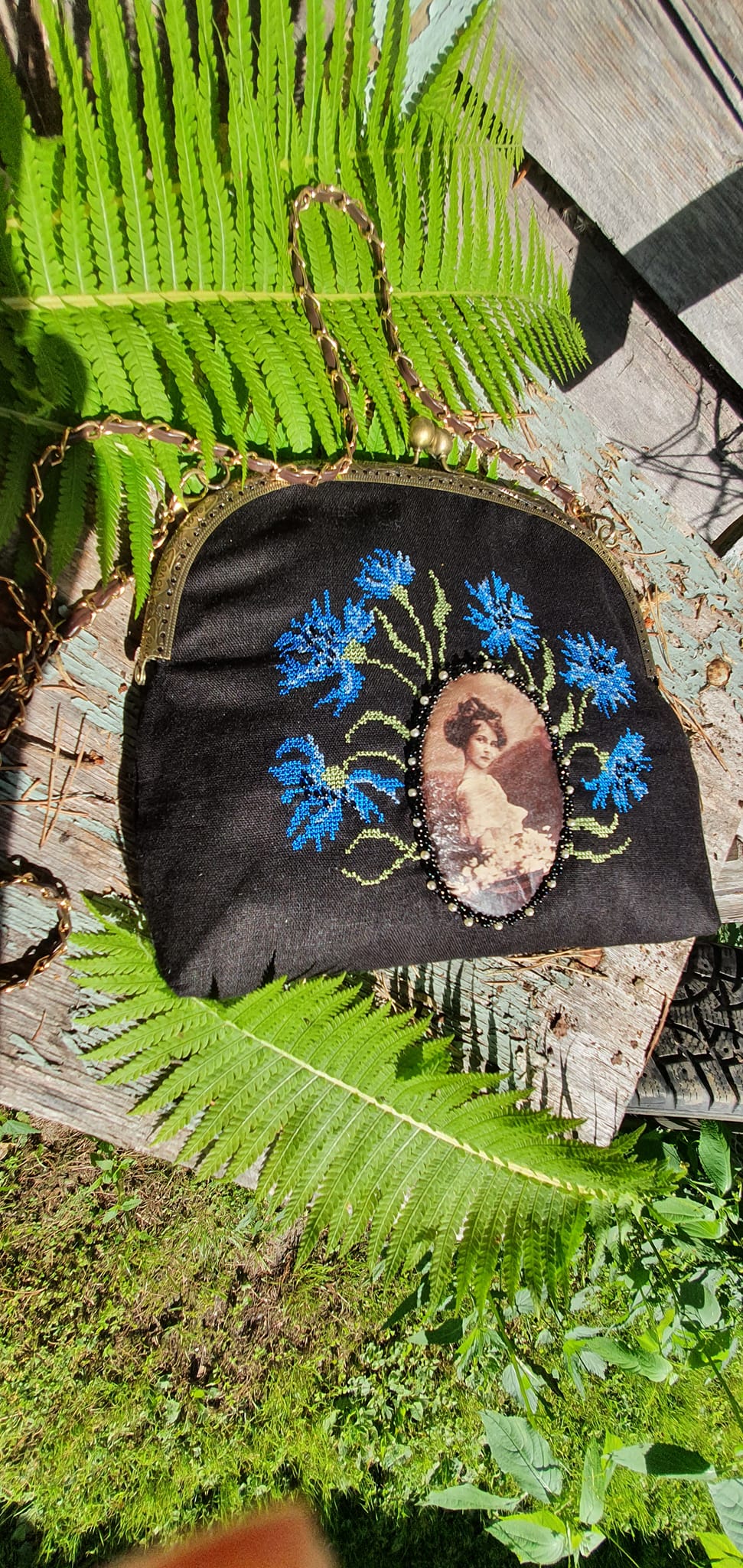 Ristpistes tikitud rukkililledega&vintage pildi ja pärlitega pika sangaga vintage kott.
