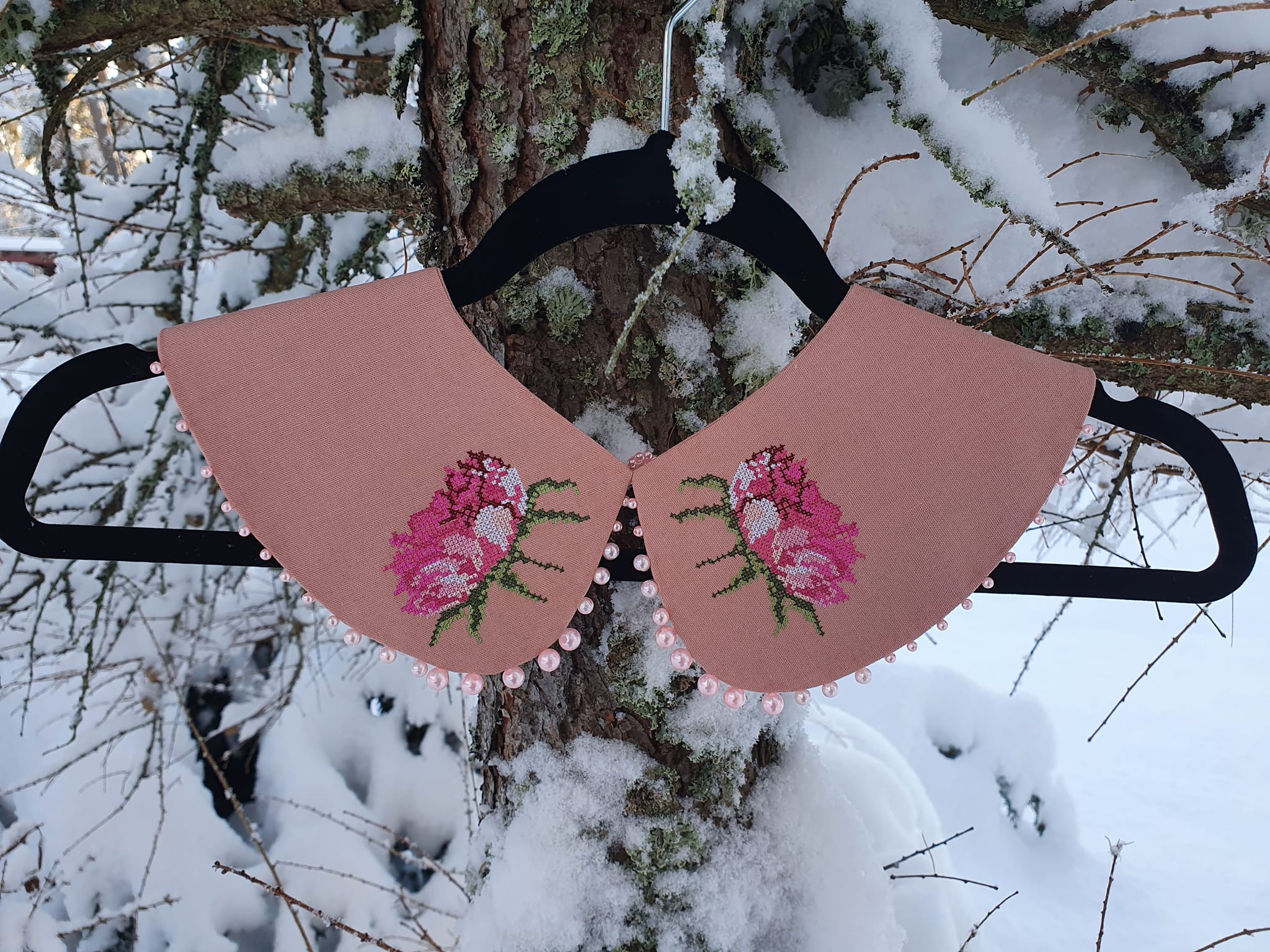 Virsikuroosa ristpistes tikitud pojengiõiega linane krae. Allääres kaunistuseks roosad pärlid. Kinnitus taga pärliga.