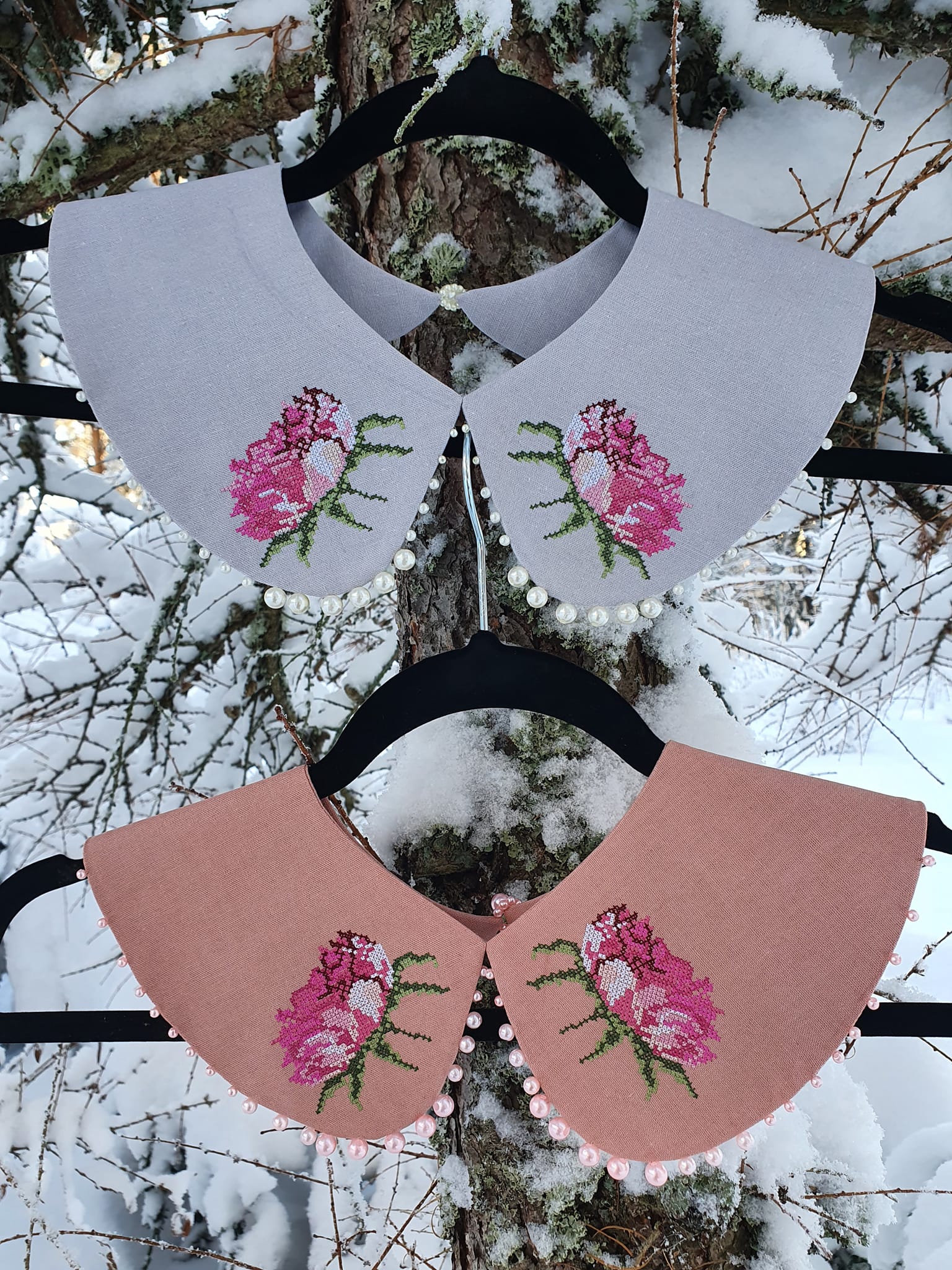 Virsukuroosa pojengiõie&pärlitega linane krae.
