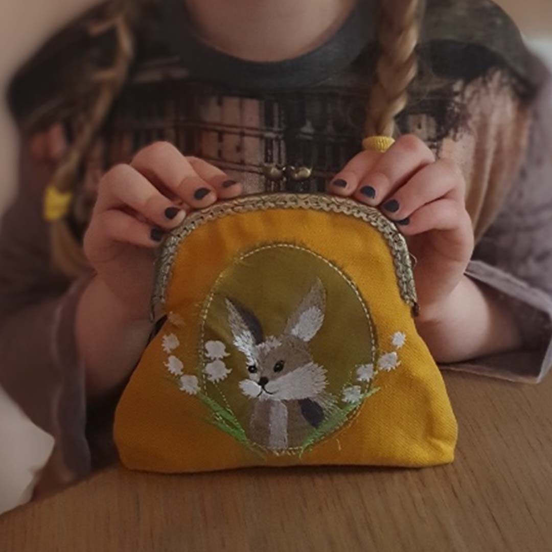 Vintage kollane tikitud jänku&piibelehtedega kotike