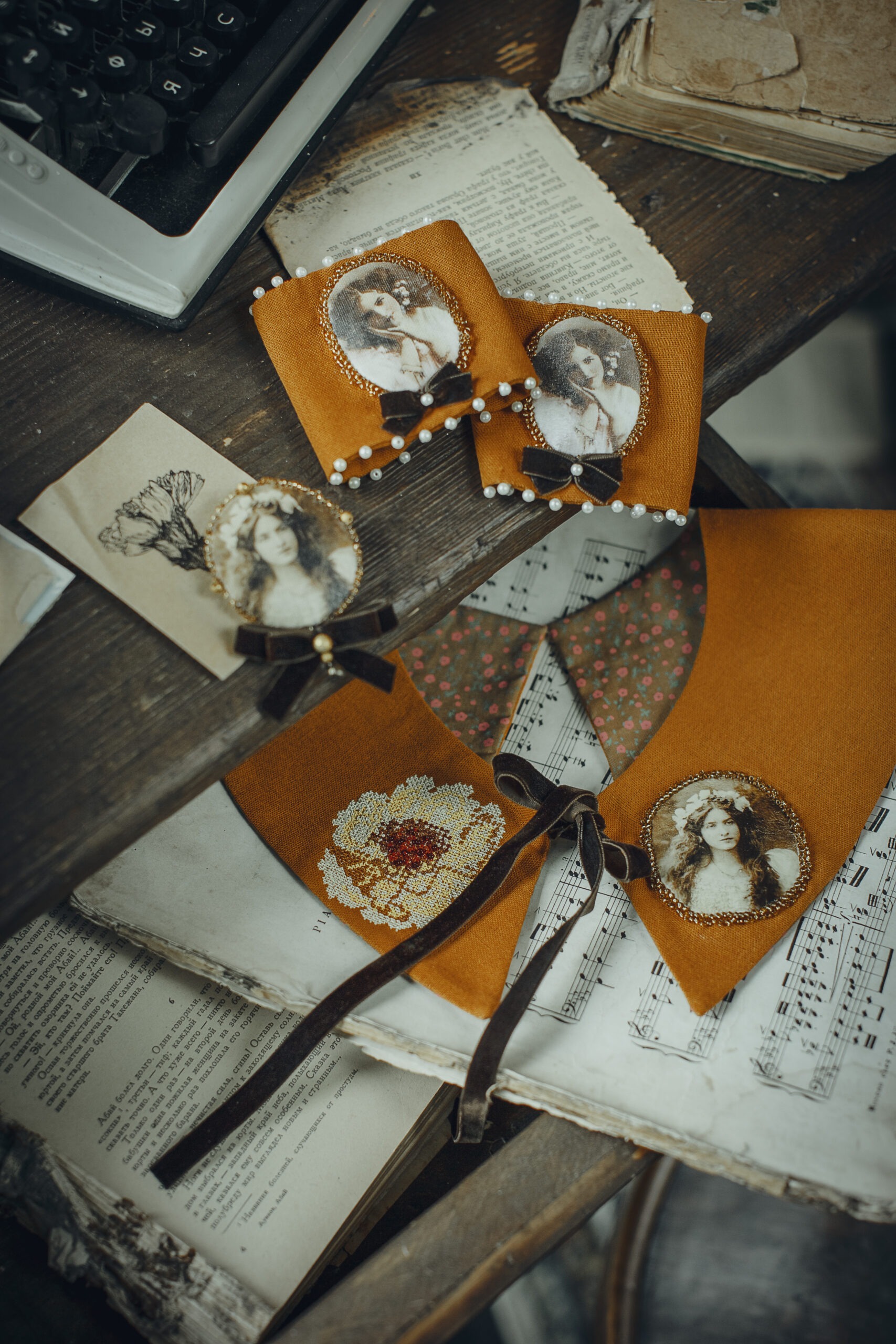 Oranzikas-pruunid linased kätised. Vintage naised lipsuke+pärlid kaunistuseks. 2tk komplektis.